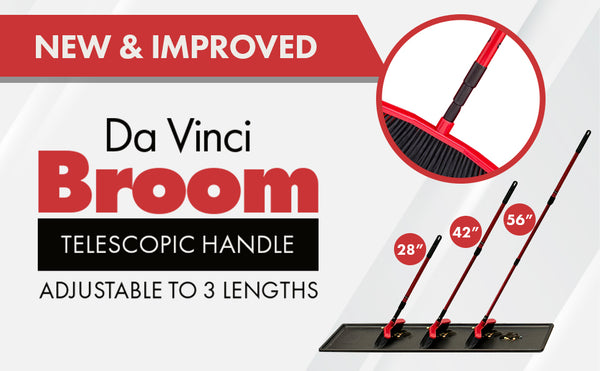 Da Vinci Brooms feature curved ends to funnel dirt toward the center of the broom, eliminating spills from the sides while creating a neat pile in the center. The low profile head gets under most cabinets and equipment while the flared edges sweep along walls and into corners easily. The lightweight design reduces fatigue. Da Vinci HOUSE Broom is available with a 14-inch curved head and Da Vinci SHOP Broom features a 25-inch curved head.